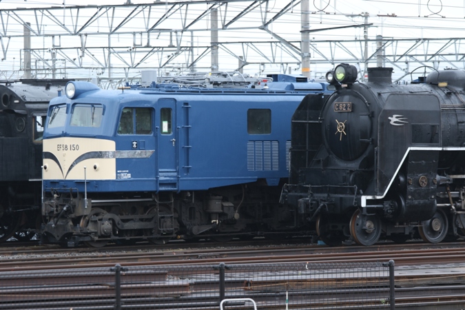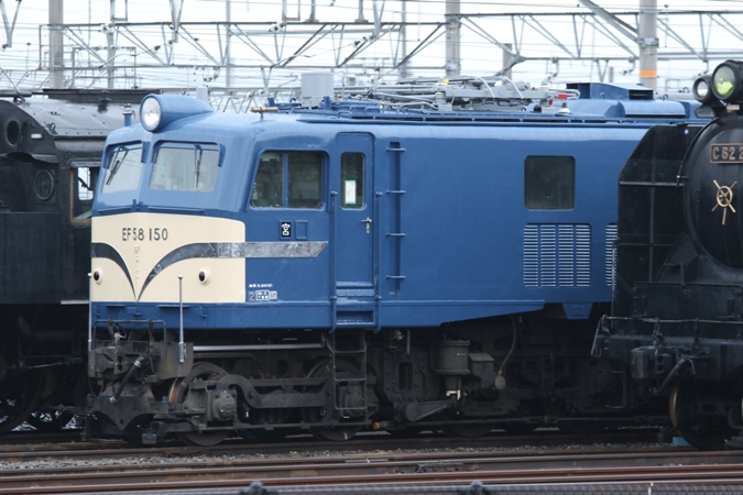 本題というのはEF58 150。手前に連結されていたEF65 1がどこかへと移動したため撮影しやすくなっており、しかも隣にC62 2が留置されているということで、播但線の後の空き時間で訪問しようと急遽思いついた次第です。