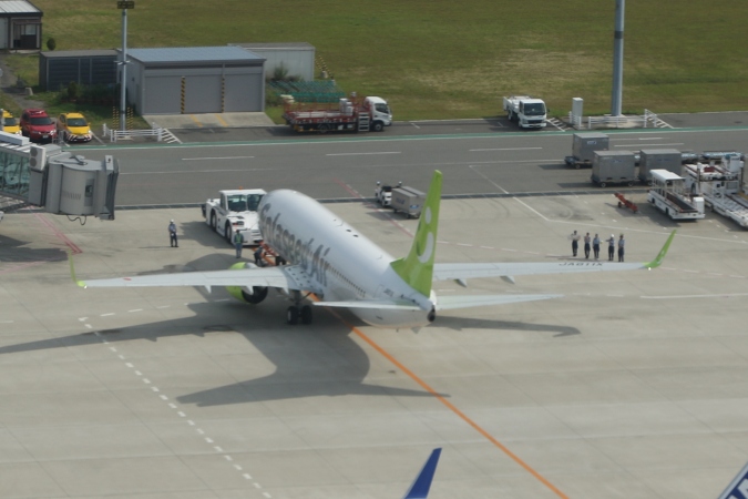 新神戸で地下鉄に、三宮でポートライナーに乗り継ぎ、眼下にソラシドエア機を見つつ神戸空港に余裕を持って到着。手荷物の三脚を預け、保安検査場も通過して一息入れようとスマホでfacebookを確認したところ、見覚えのあるソラシドエア機の写真と共に「遠くに行きます。」などというゼニガタ氏の書き込みを発見。