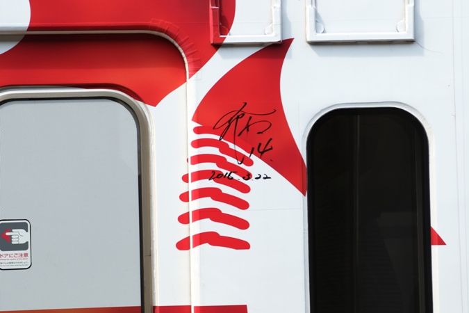 停車中に車両を見ていたところ、クハ115-2001のドア脇にサインが書かれているのを発見!