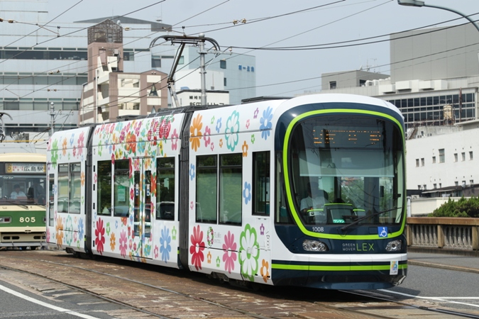 フラワーフェスティバル・路面電車まつりPRラッピングだった1008号ですが、それらの文字を消し花柄のみのラッピングで運用されていました。撮影出来ないと思っていただけにありがたいです。