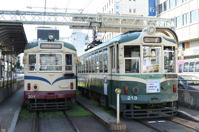 ツーマン塗装の200形213号が来ました。ちょうど201号と並んだので撮影。201号は更新工事で前面窓を拡大しているので印象が異なりますね。