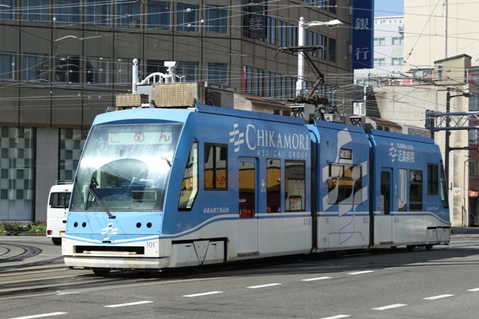 そして街中でももの凄く目を引く600形610号。パチンコ屋「ホームラン」の全面広告ですが、正式には「ランちゃん電車」と呼ぶそうでして、入口左にいる「春野ラン」が最初のキャラクターだったことからその名が付いたそうです。その後、他の4人が増え合計5人となって現在に至るとか。