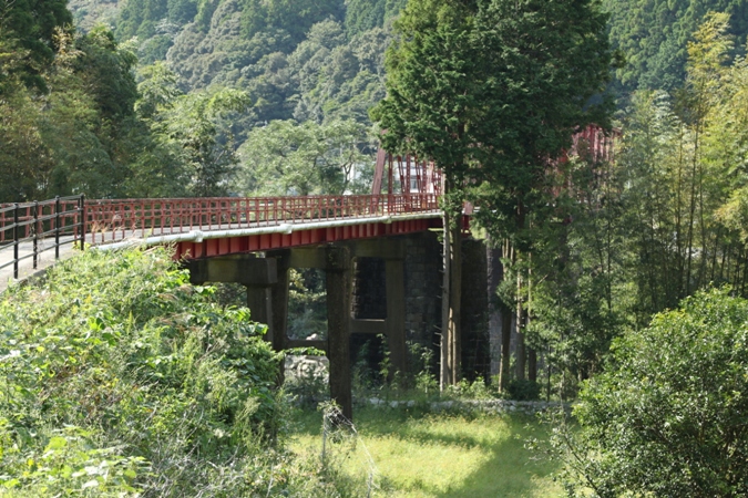 ある程度下ってきた時におもむろに視界に飛び込んできたアーチ橋。掘ヶ生(ほりがを)橋で、昭和16年築の鉄筋コンクリート造。同時期の橋としては国内最大級とのことで、橋の中央にある待避所が鉄道で使用されていた時代を偲ばせます。