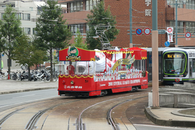 そして、本日のお目当てである貨50形51号。フラワーフェスティバルの際に花電車として使用されている車両で、9月30日より広島東洋カープのセ・リーグ優勝を記念した花電車なっています。