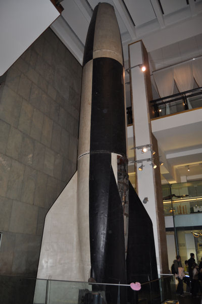いまや当たり前のように打ち上げられているロケットですが、その技術自体は11世紀に中国が兵器としてロケットを使用するなど、短い距離での打ち上げには成功していました。しかし、これが長距離の打ち上げに成功するのには長い時間がかかり、ナチス・ドイツが戦前に開発したV2ロケットまで待たなくてはなりません。V2ロケット (ロンドン・サイエンスミュージアムにて)