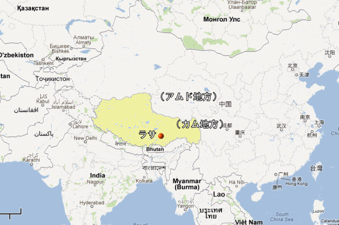 現在の西蔵自治区(黄色の部分)と、かつてのアムド地方、カム地方の位置図 *グーグルマップを加工
