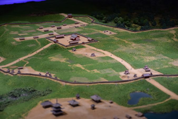 この模型は780(宝亀11)年、伊治呰麻呂の乱で一時焼失した後に再建された姿。伊治呰麻呂(これはり/これはる の あざまろ)は蝦夷の指導者で、この乱の後の動静はよくわかっていません。