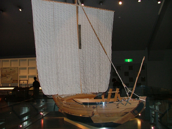 これが菱垣廻船の復元模型(江戸東京博物館にて)。日本最大の消費地である江戸へ、これを使って様々な物資を運んでいたわけですね。ちなみに、元々は廻船問屋が運行していたのですが、海難事故の処理問題や船員の不正が続出。十組問屋は、これに対抗して様々な業種の問屋が手を組み、その発言力で菱垣廻船を支配下に置いたという事情もあります。何しろ、当時は船が無いと物資を大量に運べなかったのですから、船は非常に重要な輸送手段。廻船問屋の好きに任せたまま、というわけにはいかなかったわけです。
