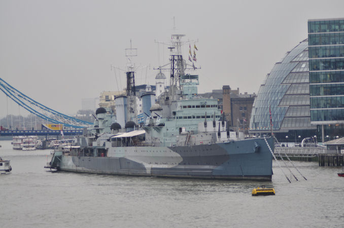 まだ撮影し忘れたものがあるので、昨日と同じルートを行きます(なんと効率の悪い・・・)。というわけで、またテムズ川に係留されているベルファスト号を見ます。今日も昨日と同じ空模様なのが残念。