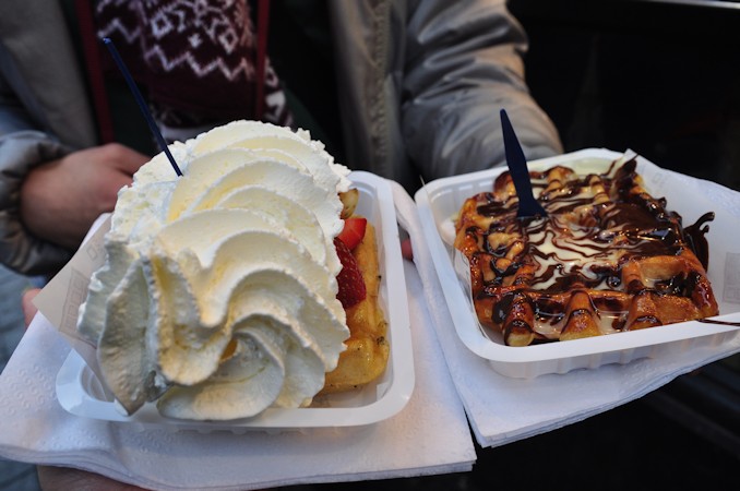 さて、そのすぐ近くのお店にて。やはり、ベルギーと言えばベルギーワッフルでしょう。店員の女性の方が、こんなサービスをしてくださったのですから、買うしかありません!(カメラの角度をもう少し上にしておけば・・・)