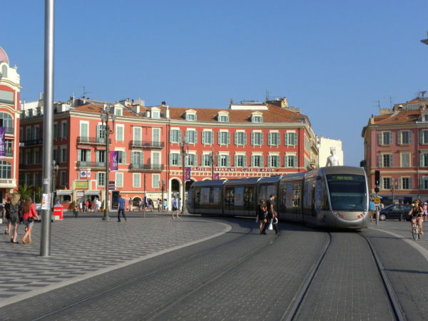 アルストム社のシタディス302ニース仕様。街の中心に位置するマセナ広場を横断するところを撮影。ちなみにフランスのトラムは道路と同じように右側通行。